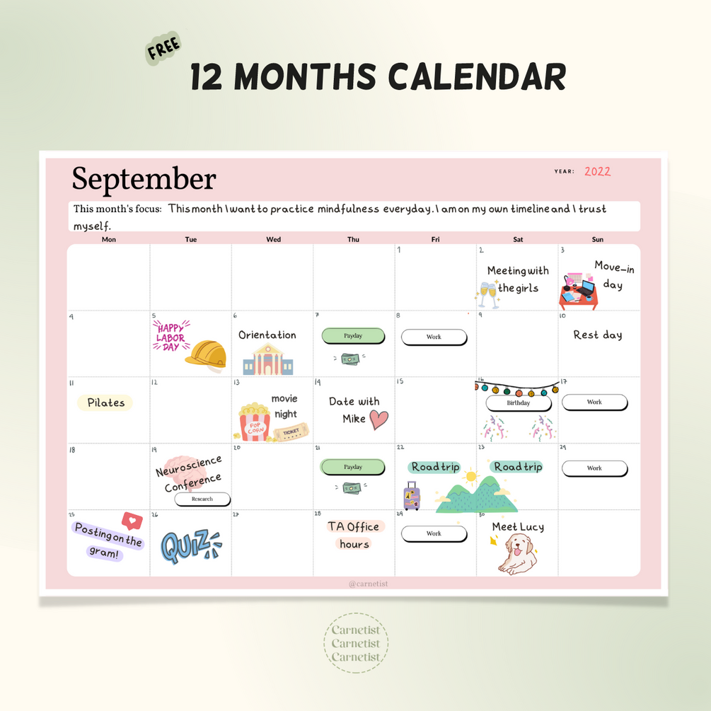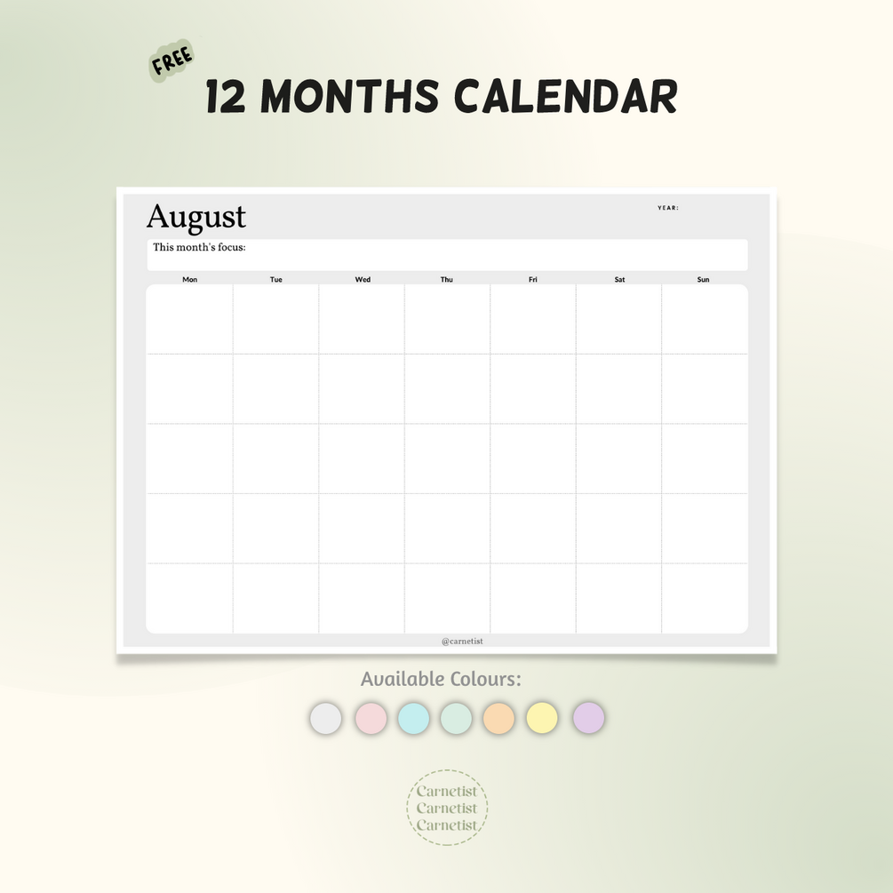 Hi You! I am excited to present you the 12 months colourful calendar. There are a lot of variations of this monthly calendar planner to choose from. Note also that this calendar is undated so that you can use it any year.